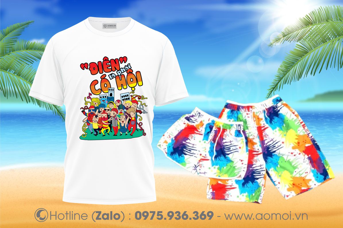 Áo sử dụng màu trắng chủ đạo với slogan màu đen in trước ngực vô cùng nổi bật. Và chắc chắn chiếc quần đùi nhiều màu sắc là một phần không thể nào thiếu được trong mẫu đồng phục đi biển này.